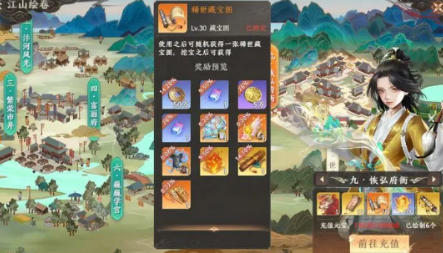 游戏内设四阶藏宝图系统:普通级、中级、高级与稀世级,品质越高开启的奖励越丰厚。